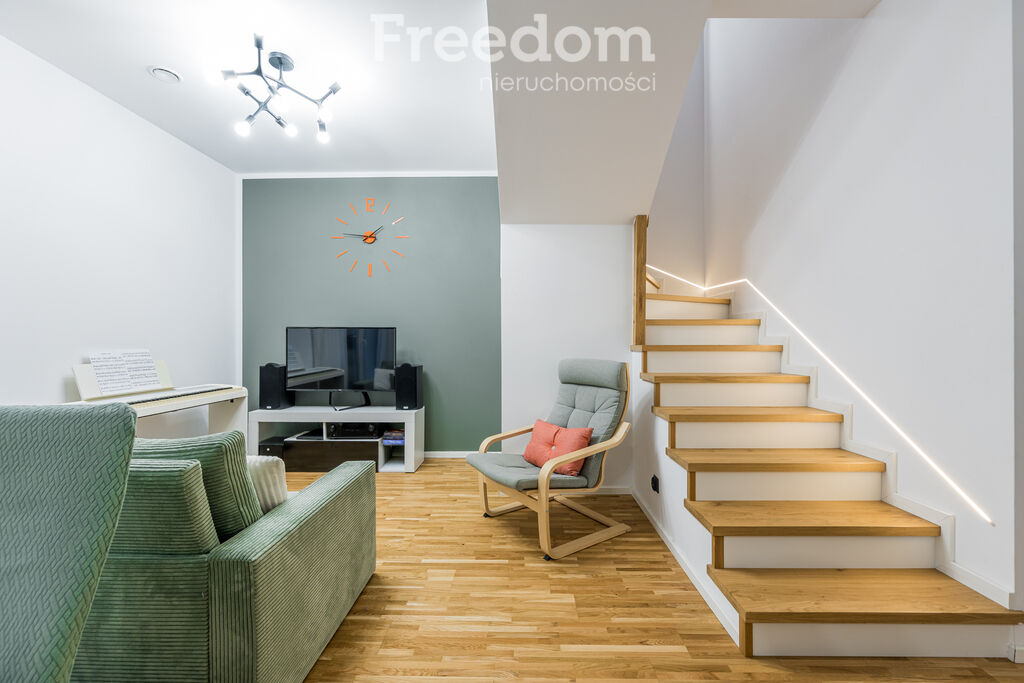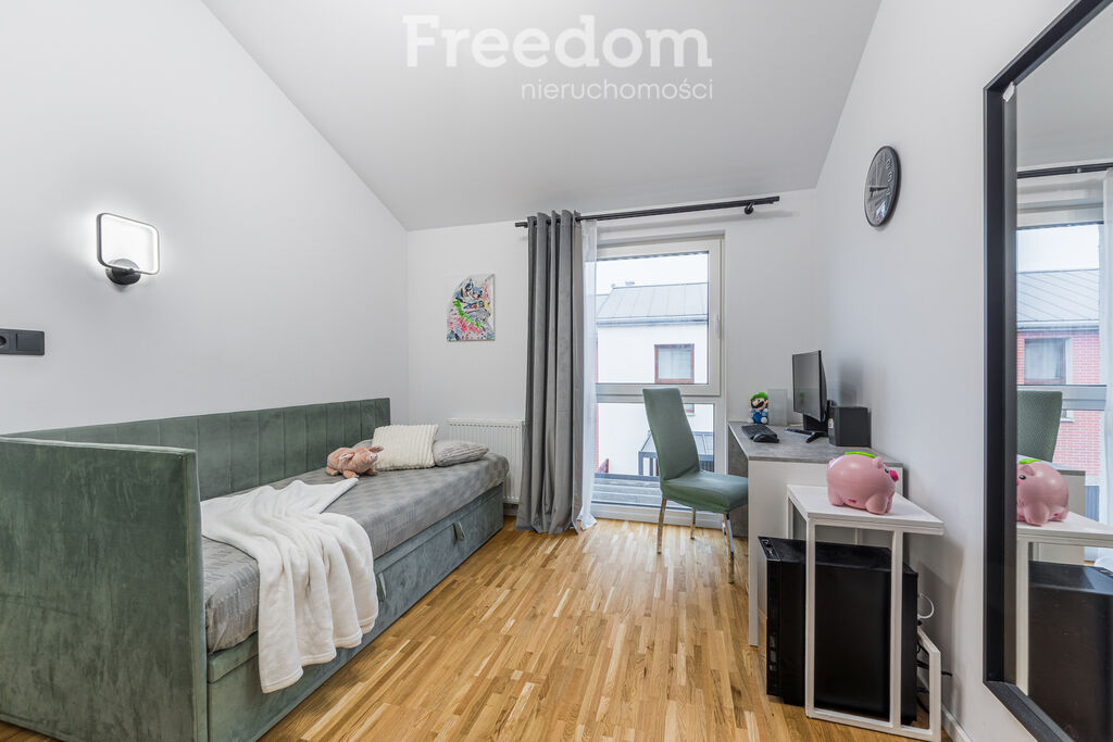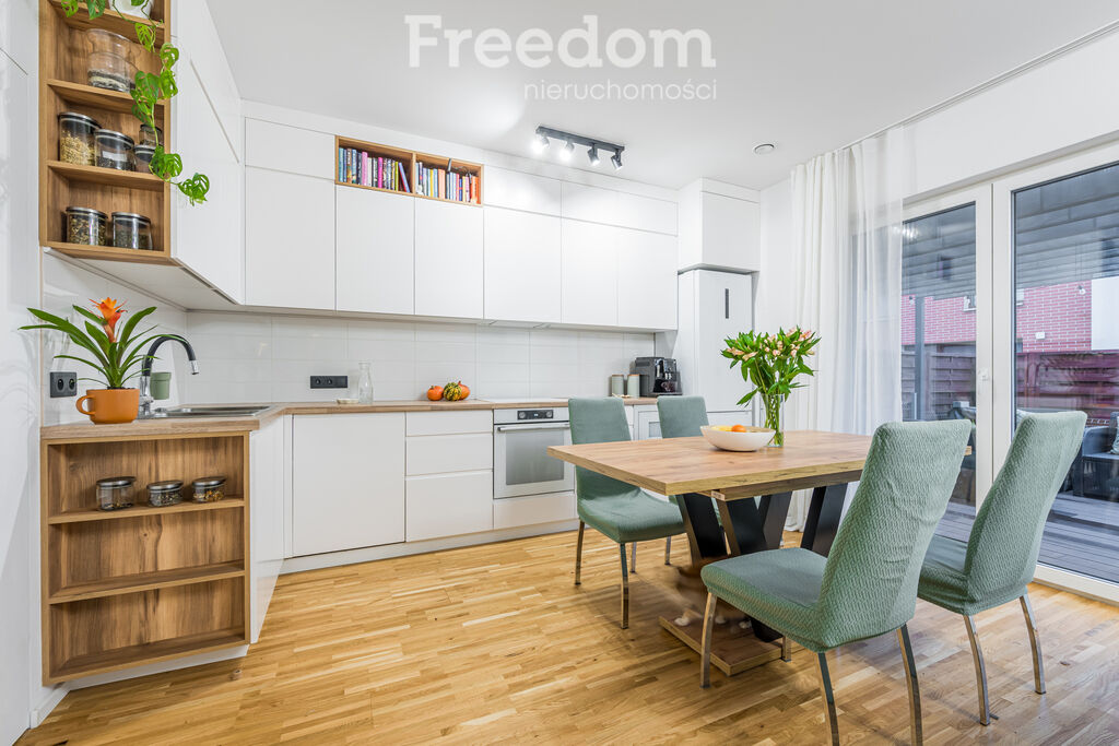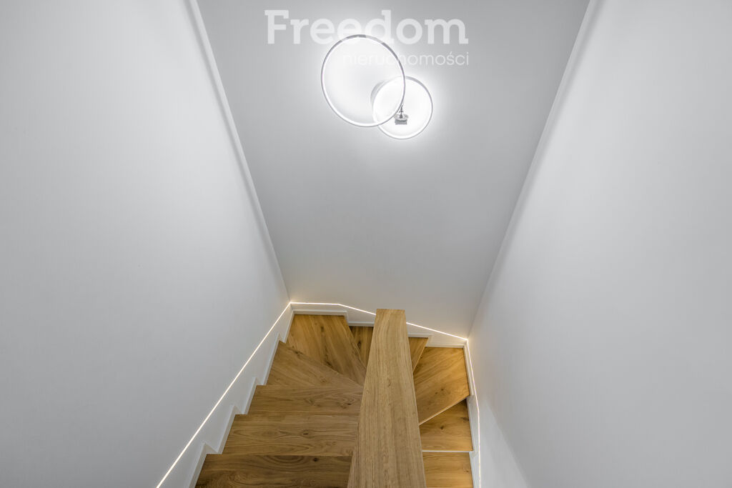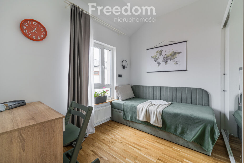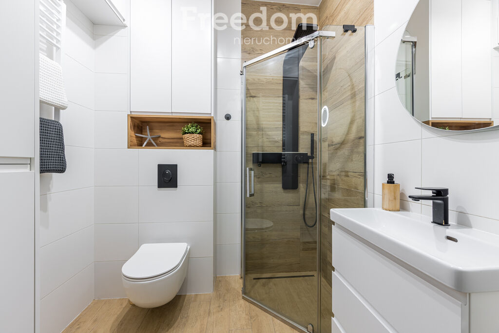 Na podłodze znajduje się dębowy parkiet oraz płytki. Okna PCV
