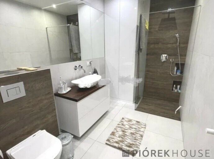 • łazienka wyposażona w prysznic, toaletę oraz szafę w zabudowie