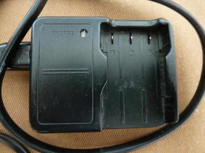na wyjściu 4,2 V, 0,8 A, 3 pin, wymiary komory na baterię 33x50 mm, stan dobry, ładuje akumulatorki NP-500, NP-600, ...