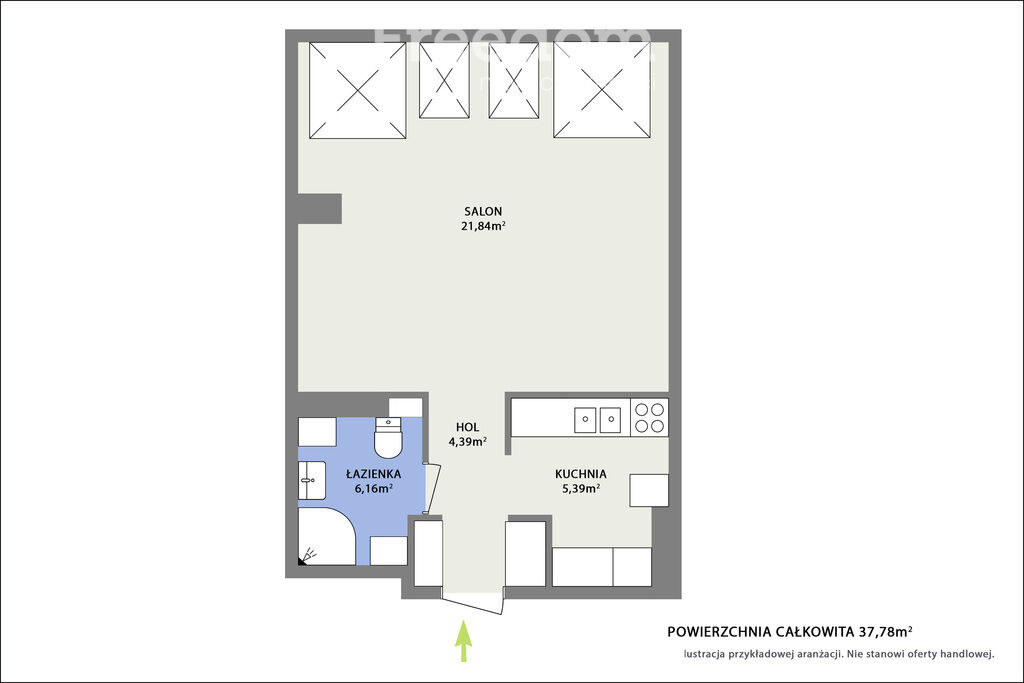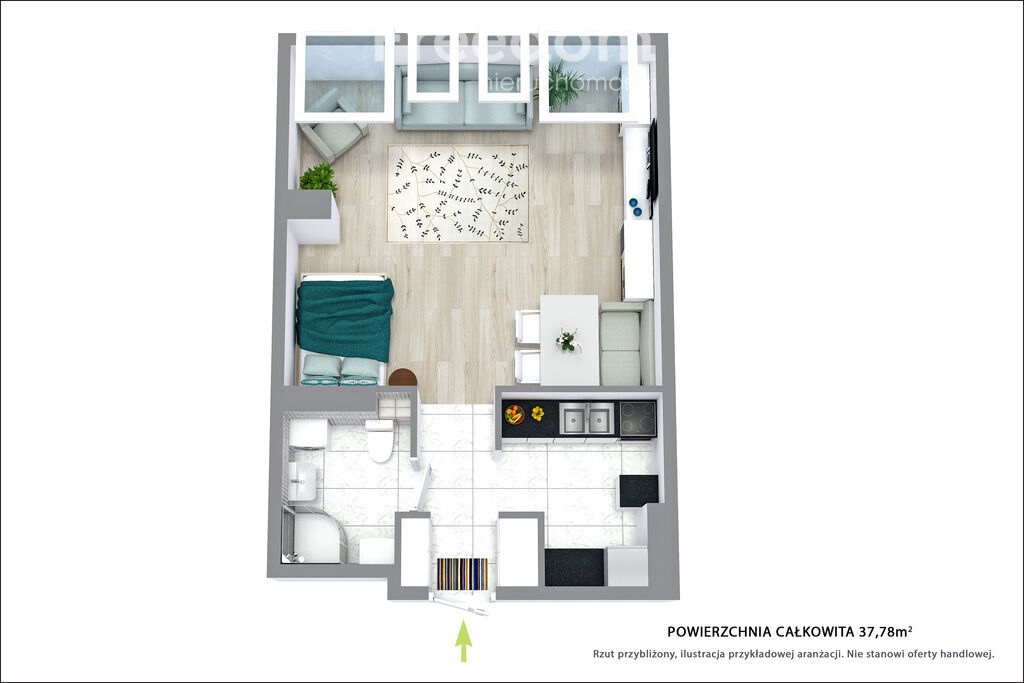 - Przestronne 37,8 m² – więcej miejsca niż w typowej kawalerce,