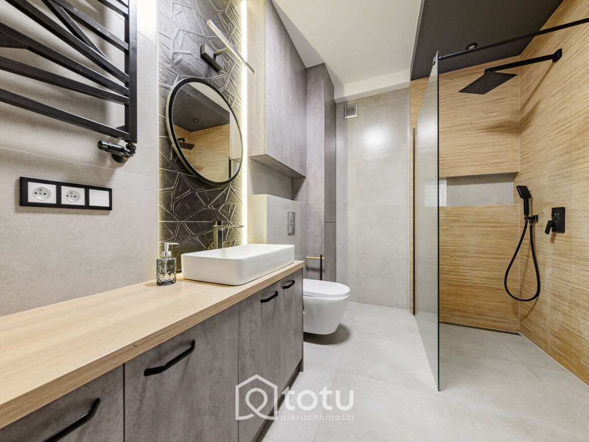 • przestronna łazienka z prysznicem, WC, umywalką, miejscem na pralkę i suszarkę,
