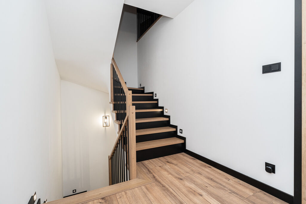 Schody dębowe, drewniane balustrady, oświetlenie z czujnikiem ruchu.