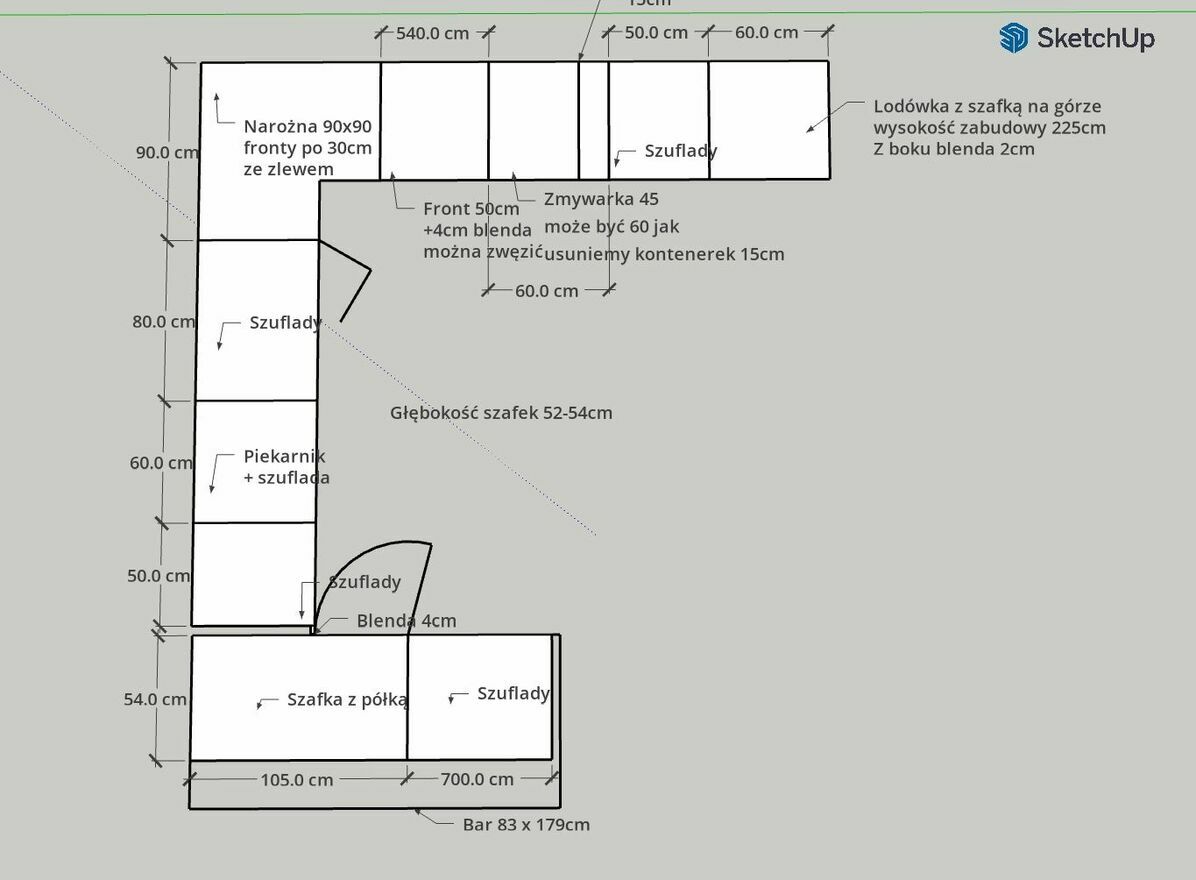 - Bok z lodówką - 312 cm + 20cm pod okno