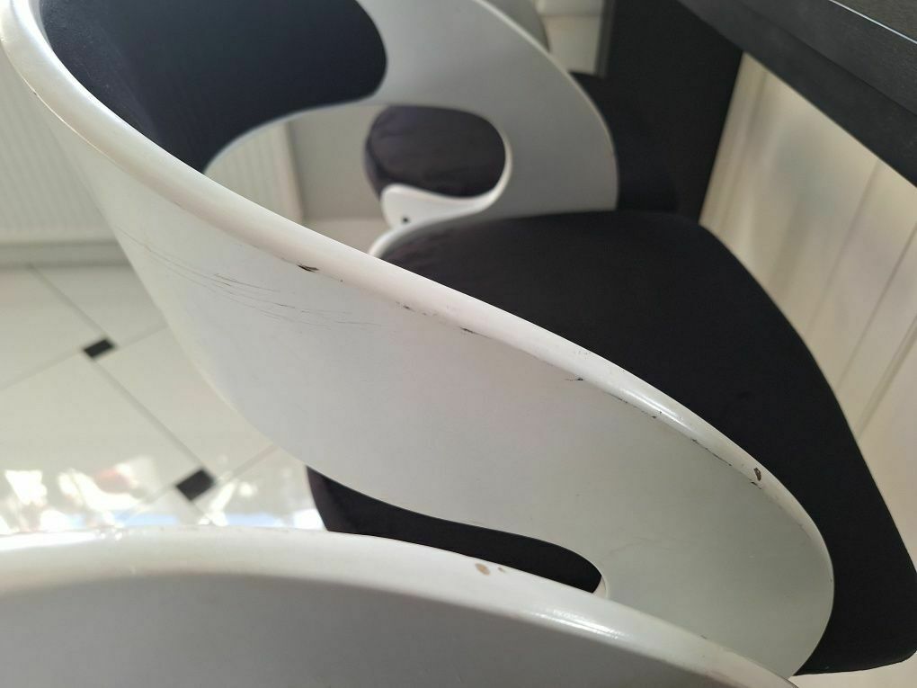 Normalne ślady użytkowania. Małe odpryski na frontach i szufladach od talerzy/garnków. Delikatnie spuchnięty blat na łączeniu przy zlewie.
