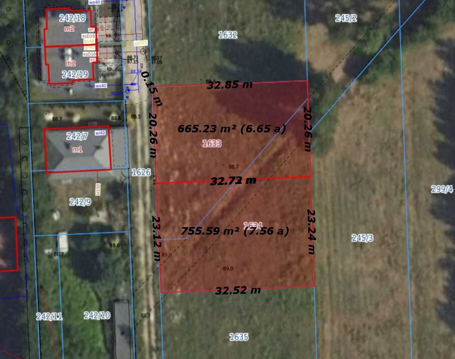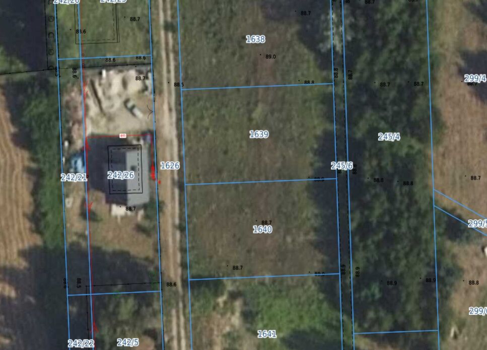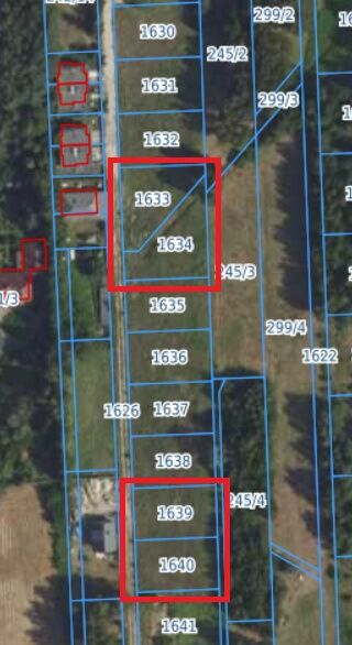 Informacja dodatkowa: Działki o nr 1633 i 1634 będą miały prostokątny kształt oraz projektowane wymiary i powierzchnie jak na zdjęciu nr 3 (w trakcie procedowania przebudowa rowu melioracyjnego, tak by biegł wzdłuż granic działki nr 1634 i podział geodezyjny, by działki miały prostokątny kształt).