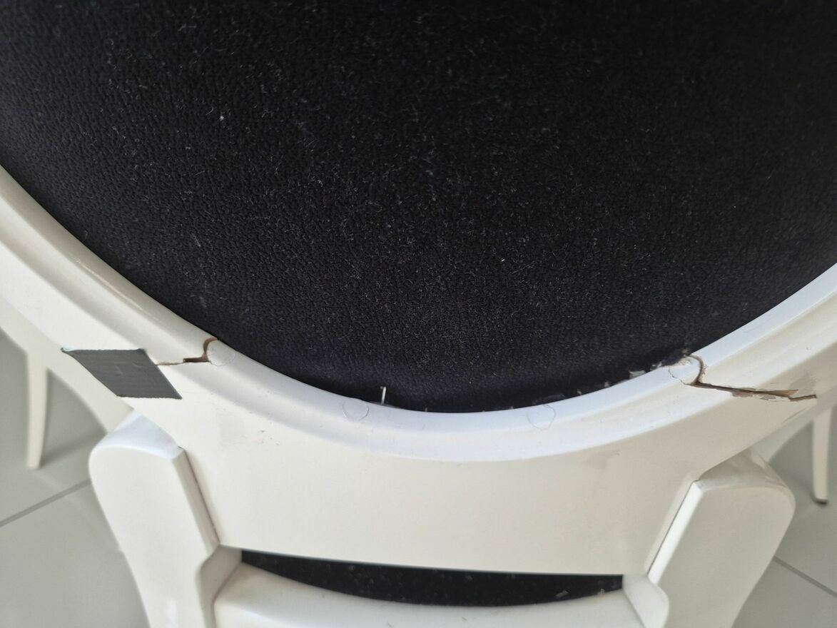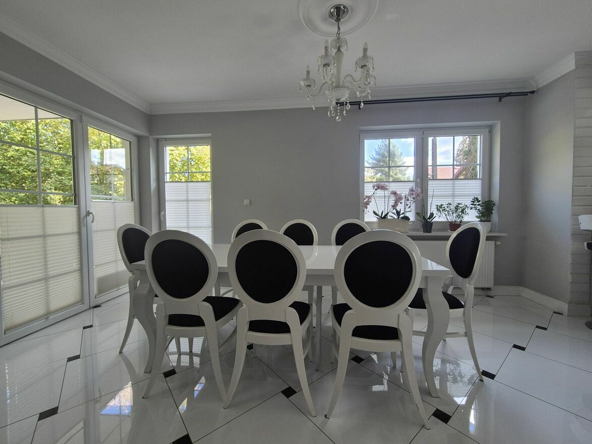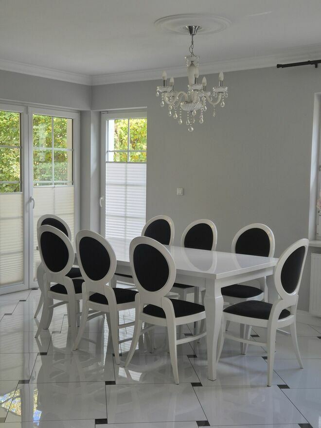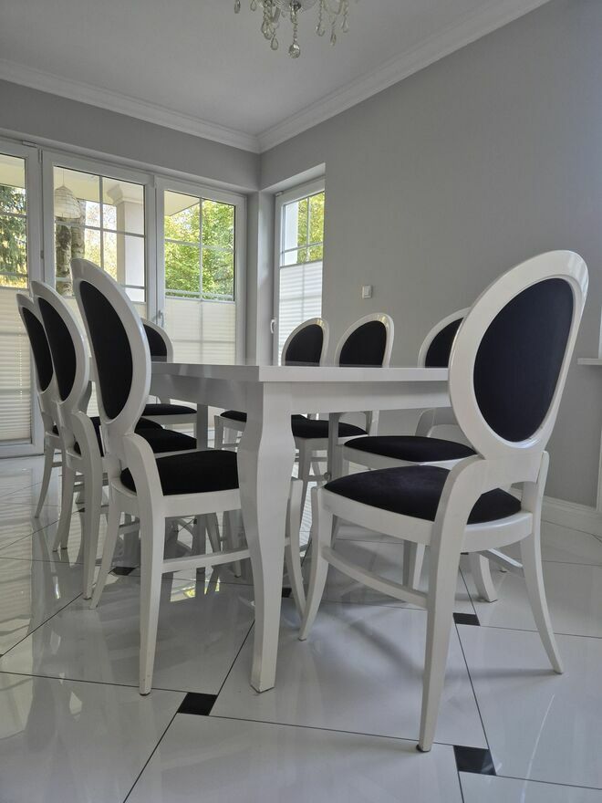 Elegancki, rozkładany stół z krzesłami w stylu klasycznym. Stół 200x100 cm rozkładany do 400cm!!! Krzesła posiadają czarne tapicerowane siedziska i oparcia z łatwego w czyszczeniu materiału.Nogi posiadają delikatne odpryski. Blat w bardzo dobrym stanie. 7 krzeseł. 1 uszkodzone do naprawy - na zdjęciu.